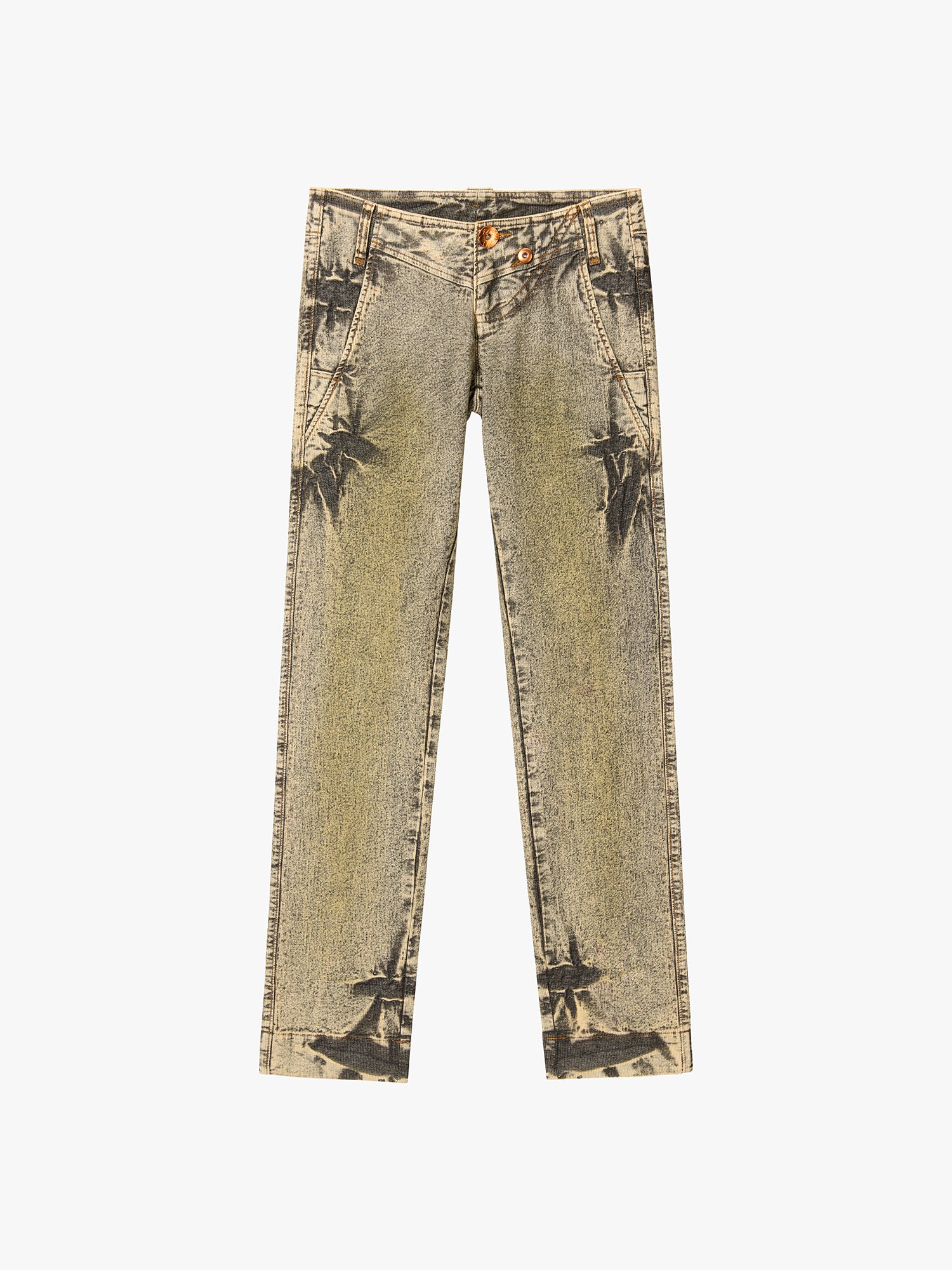 The Miss Sixty x KNWLS Collection features jeans with a unique deconstructed cut and low-waist silhouette, accented with leather logo patchwork details. Specially treated fabric redefines the traditional look and texture of denim, while nostalgic washing and dyeing techniques create an irregular tie-dye effect, making each piece unique and embodying a futuristic aesthetic.