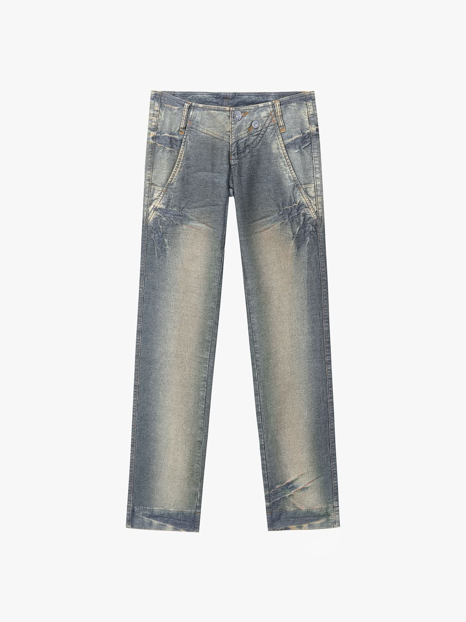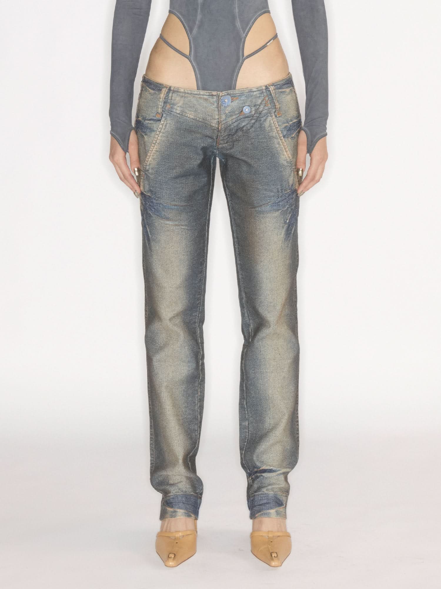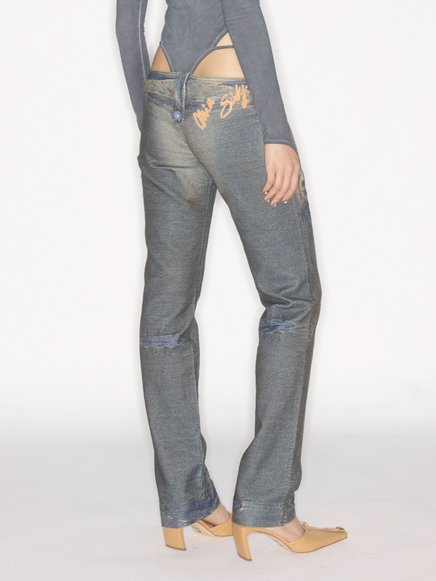 The MISS SIXTY × KNWLS collaboration features jeans with a unique deconstructed cut and low-waist silhouette, accented with leather logo patchwork details. Specially treated fabric redefines the traditional look and texture of denim, while nostalgic washing and dyeing techniques create an tie-dye effect, making each piece one-of-a-kind and embodying a futuristic aesthetic.