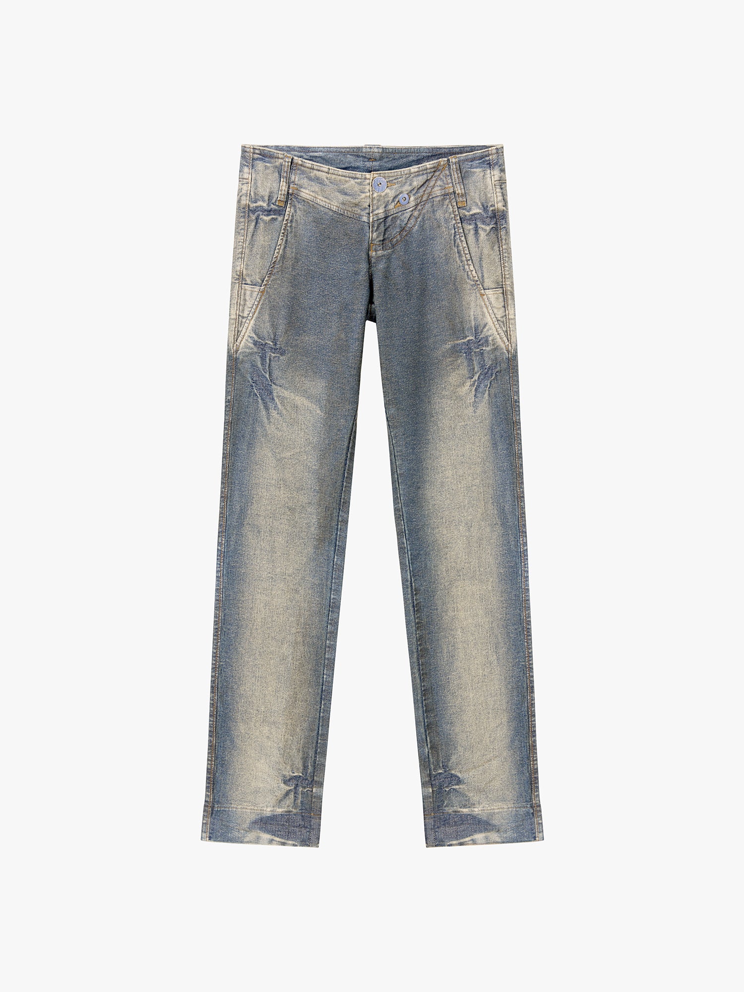 The Miss Sixty x KNWLS Collection features jeans with a unique deconstructed cut and low-waist silhouette, accented with leather logo patchwork details. Specially treated fabric redefines the traditional look and texture of denim, while nostalgic washing and dyeing techniques create a tie-dye effect, making each piece one-of-a-kind and embodying a futuristic aesthetic.