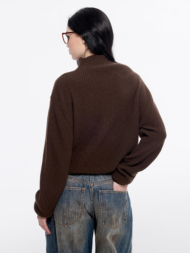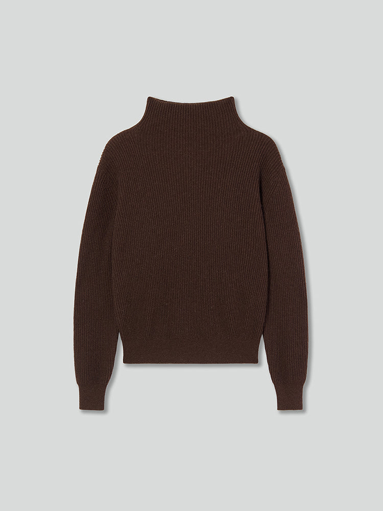 Made from fine, smooth and dense yak wool, the garment is both resilient and well-structured, offering a cloud-like lightness to the touch. The knit texture is soft and delicate, with a compact structure that gives the piece a sculpted shape. Yak wool also has excellent colorfastness; after modern processes of bleaching and dyeing, the colors appear bright and saturated, showcasing high-quality craftsmanship. The elegant turtleneck design, constructed with a knitting technique, offers both comfort and substance. The loose silhouette is tapered at the hem with fine ribbing, creating a sleek finish. Slightly cinched cuffs flatter the armline, adding both comfort and structure.