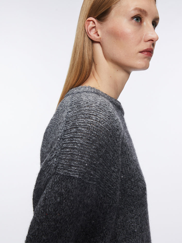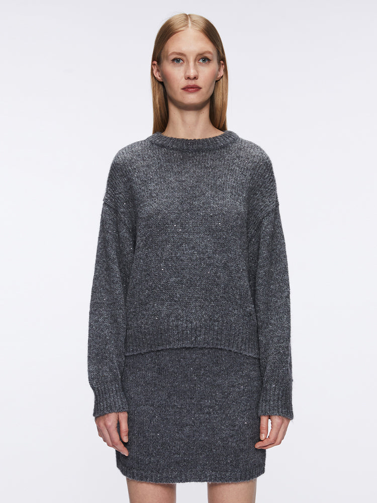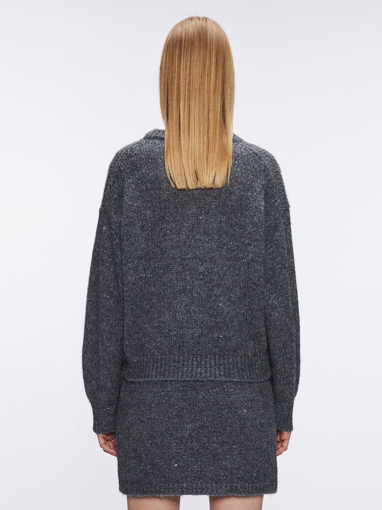 This yarn is composed of a mohair-acrylic blend combined with shiny nylon thread, featuring a sparkling pearlescent sheen. The lightweight and warm material offers comfort and stretch, while the subtly scattered sequins resemble stars adorning the fabric, reflecting a luminous glow with every movement. Underneath, a simple round-neck T-shirt with a logo-stitched band at the back provides a practical foundation. The outer layer is a thickly knitted ribbed crewneck sweater that effortlessly complements an elegant style. The ribbed cuffs create a relaxed and comfortable wearing experience, while the delicate sequins add a touch of exquisite sparkle.