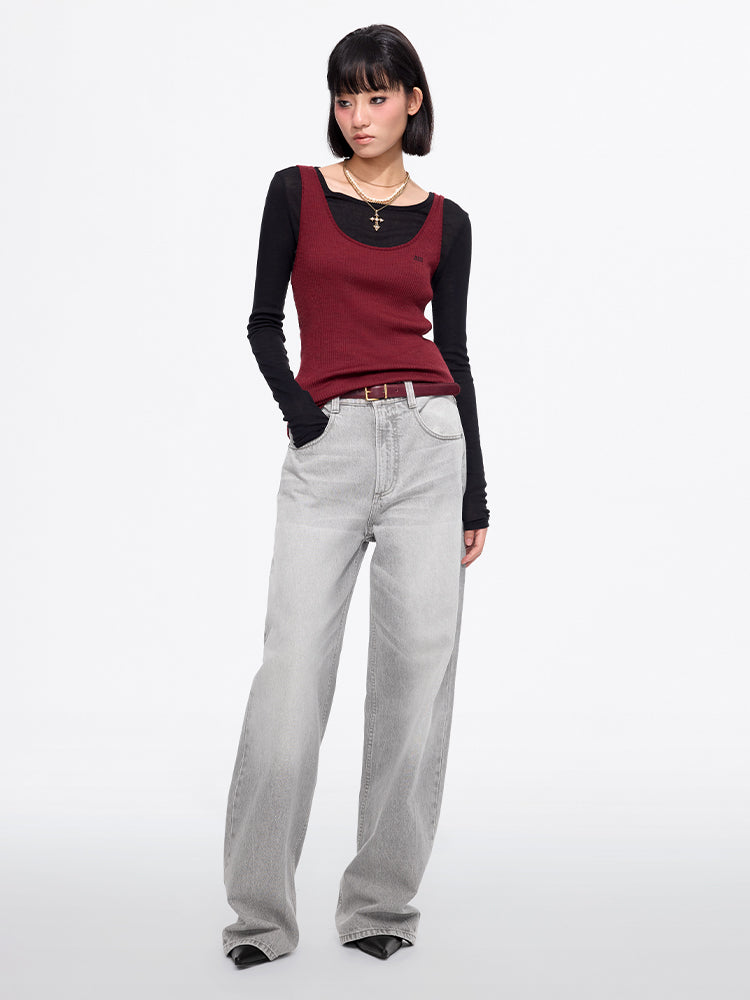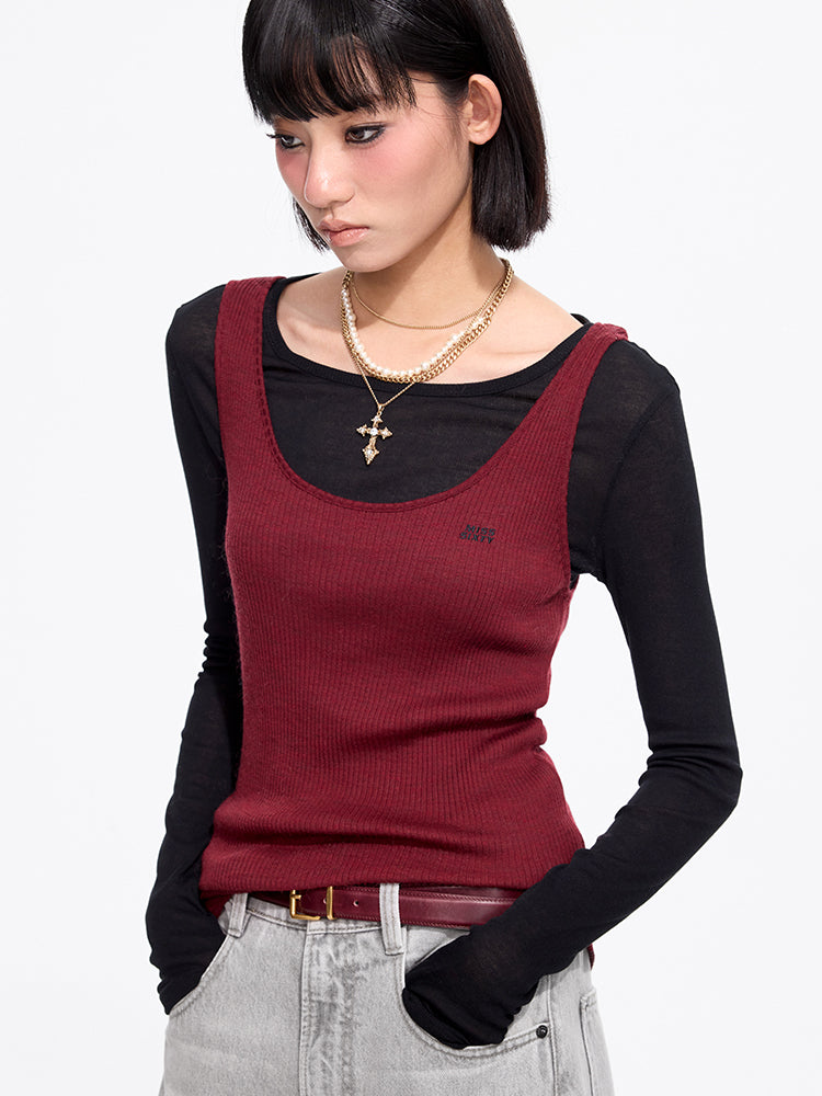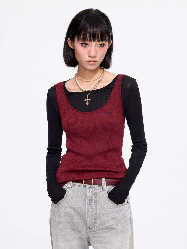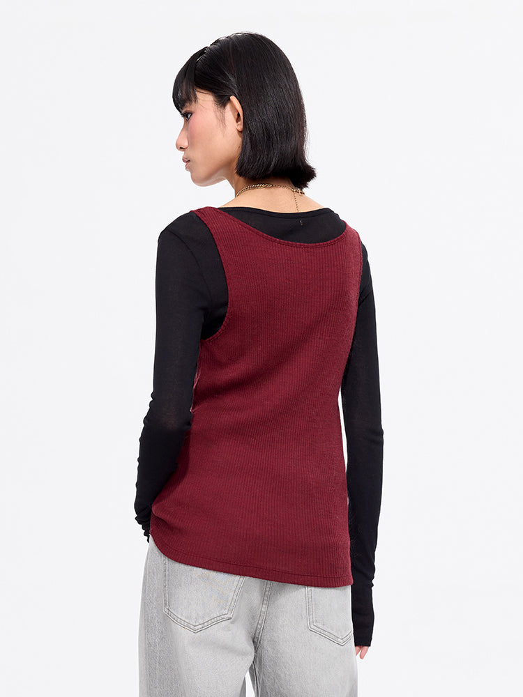 Crafted from fine wool yarn, this piece features ribbed textures that create a slimming, fitted silhouette. The merino wool provides a soft, smooth feel with natural drape, offering comfort, stretch, and a lightweight, non-restrictive fit. The simple U-neck design highlights the shoulders and neckline, showcasing feminine allure. The sleeveless cut accentuates the trapezius muscles for a cool, confident look, creating a vibrant, effortless vibe. The ribbed knit hem comfortably wraps the body for a relaxed and flattering fit.