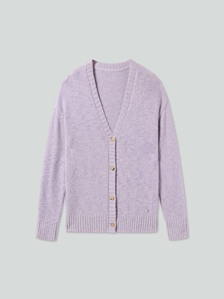 Made from sheep wool, this garment is crafted using a special spinning technique to create a fluffier yarn, resulting in a fuller and more structured silhouette. The high loft and airy, hazy texture of the fabric, interwoven with flexible fibers, offer a gentle warmth. The V-neckline features ribbed edging to enhance the texture, softly accentuating the shoulder and necklines for an elegant look. The brand's custom logo buttons have a warm hue and delicate finish, reflecting high-quality craftsmanship. A matching leather patch at the hem adds a touch of refinement, enhancing the garment's soft and graceful appeal.