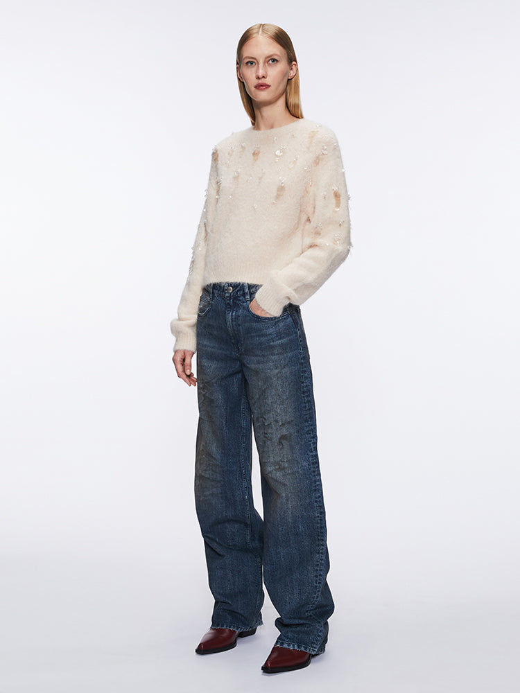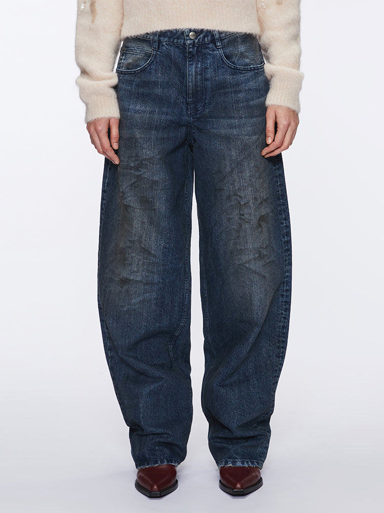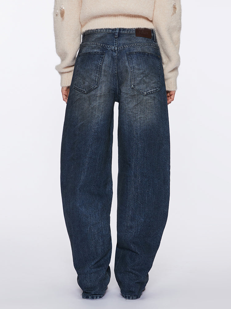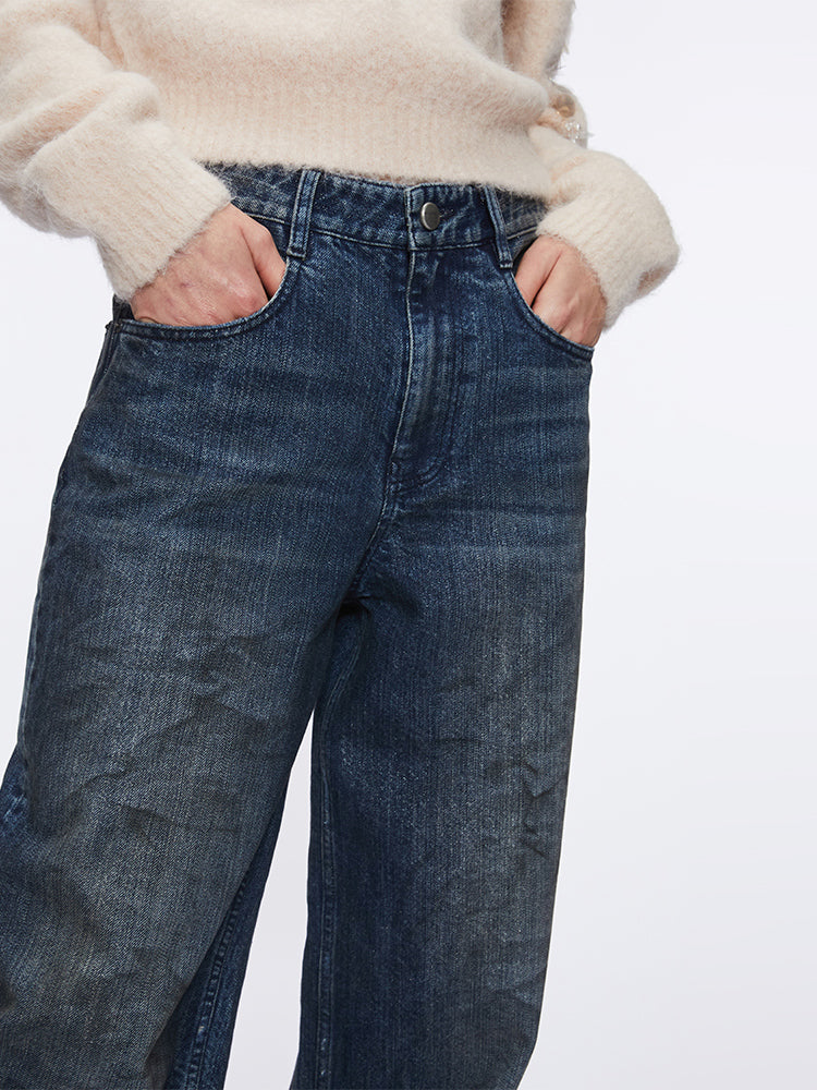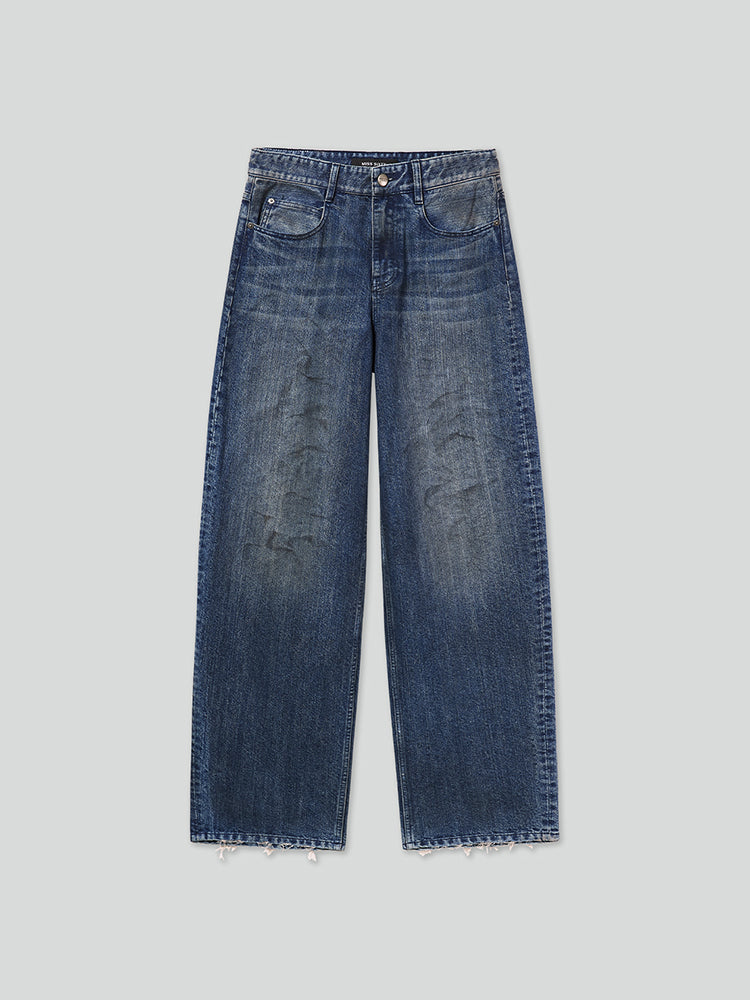 This product features high-quality denim woven with silver threads, creating a shimmering visual effect. The fabric has a clear texture and a sturdy feel, subtly exuding luxury. Through various treatments such as enzyme washing, hand scraping, edge grinding, and staining, each piece achieves a unique and striking appearance that showcases the vintage charm of denim. The distressed wash effect at the waist enhances its cool vibe, embodying a retro, post-apocalyptic aesthetic. This season’s upgraded leather patch, with a bold, raised logo, elevates the brand‘s premium appeal. The straight-leg cut, adorned with raw edge detailing, captures a carefree, urban style.