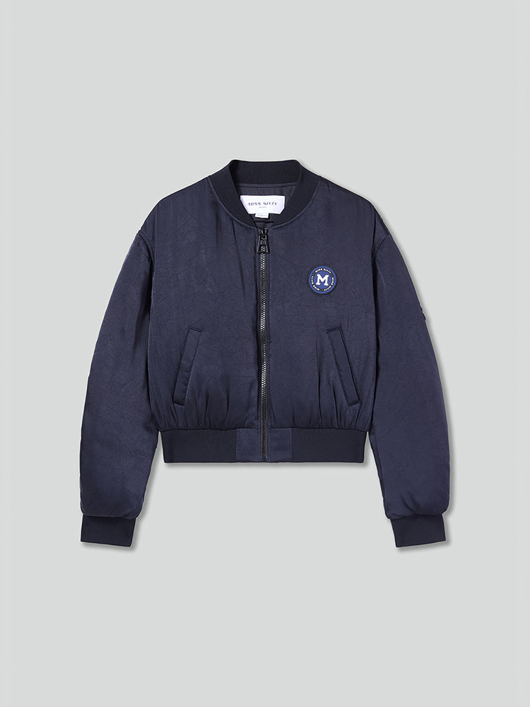 This product is made from premium polyester crinkle fabric, featuring a smooth surface that exhibits a delicate satin sheen. The material drapes naturally, providing a structured feel, while the wrinkled treatment adds a relaxed, effortless vibe. Soft and comfortable, the fabric has a warm, elegant luster. The baseball jacket-inspired stand-up collar is accented with an "M" logo patch on one side, adding a trendy touch. The ribbed hem enhances the layering of the outfit, and the side pockets provide practicality. The sleeves feature a gathered design, creating a sense of volume and refreshing the straight silhouette.
