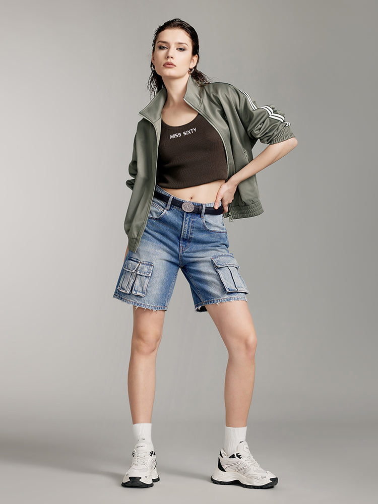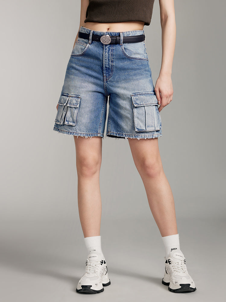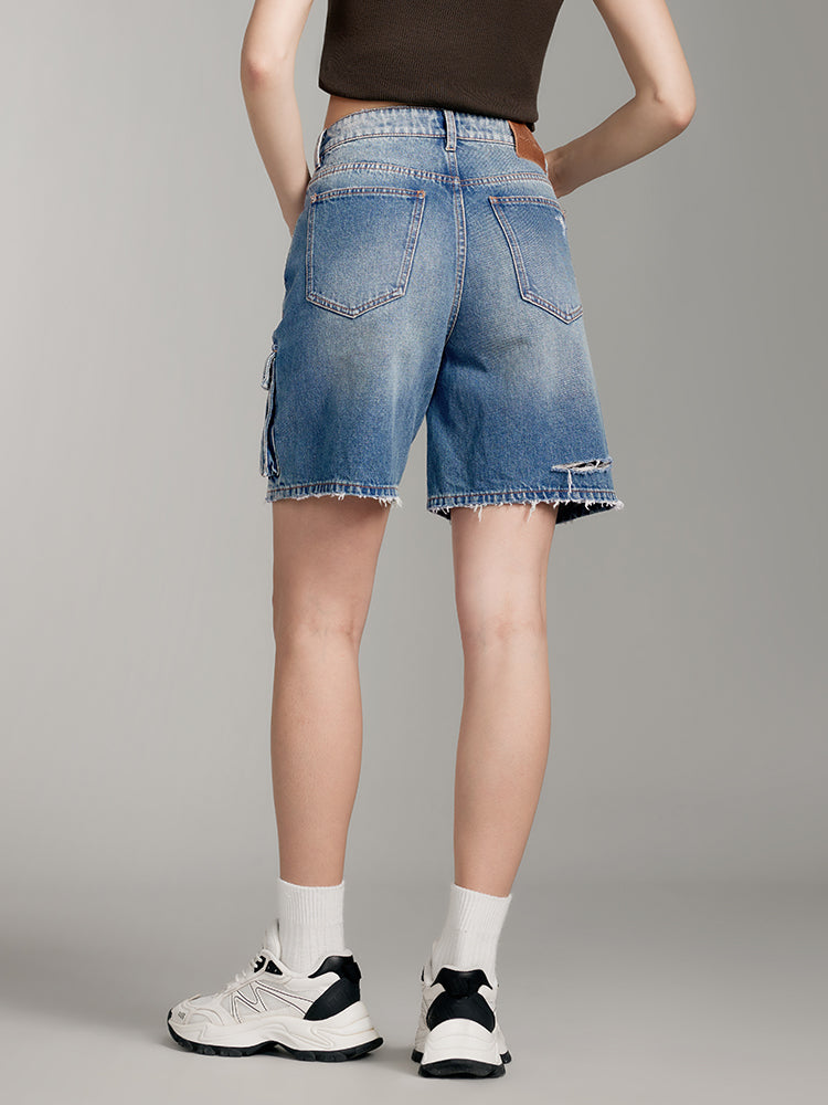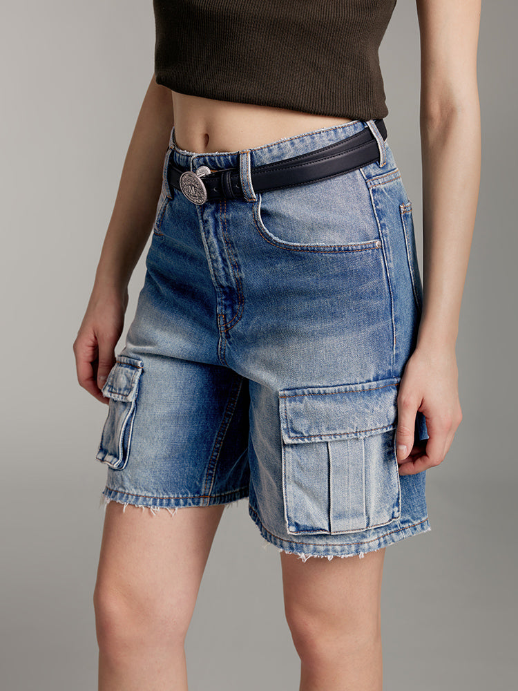 Crafted from Egyptian cotton, the denim fabric features a special weaving technique that results in a dense and structured texture. Light-colored threads enhance the clarity and cleanliness of the twill pattern, giving it a smooth and delicate touch. Comfortable yet with a sense of substance, it maintains its shape effortlessly with every movement. The utilitarian-inspired dimensional pocket design adds a touch of rebellious personality to the style. The distressed brown leather patch accentuates the retro vibe at the back waist. With distressed details on the pant legs and frayed edges, each piece is crafted to offer a unique visual appeal.
