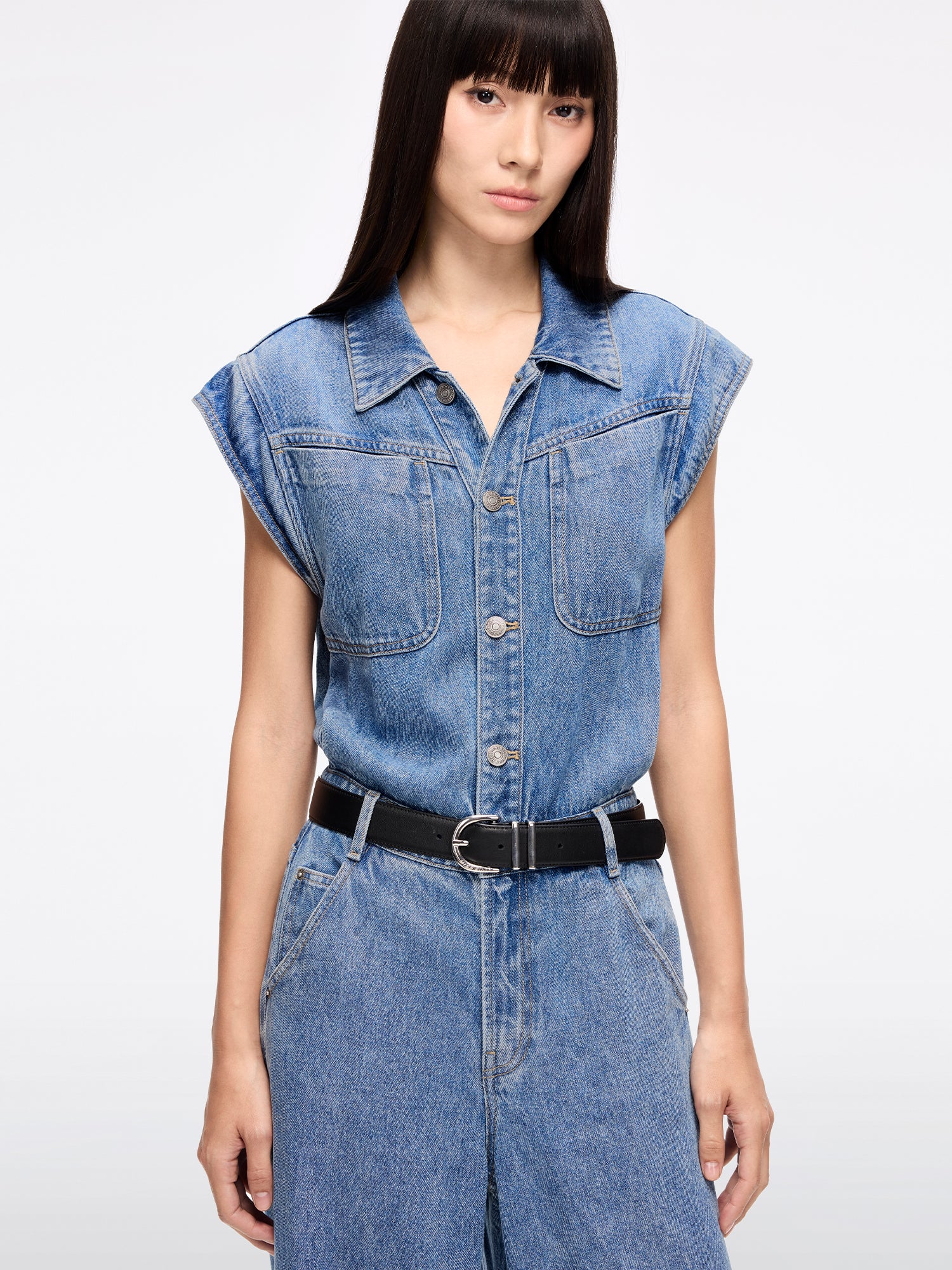 Made with Tencel, known as the "breathable fiber," this fabric enhances the drape of denim while offering a smooth, clean finish with a natural, vibrant color. The soft, skin-friendly texture ensures comfort and easy maintenance, providing a structured yet relaxed fit. The cap sleeve design offers a cool, laid-back style, while the pleated waist design enhances the silhouette. Side pockets add a touch of casual charm. The brown embossed logo waist tag at the back adds a stylish, bold accent for a modern, individualistic appeal.