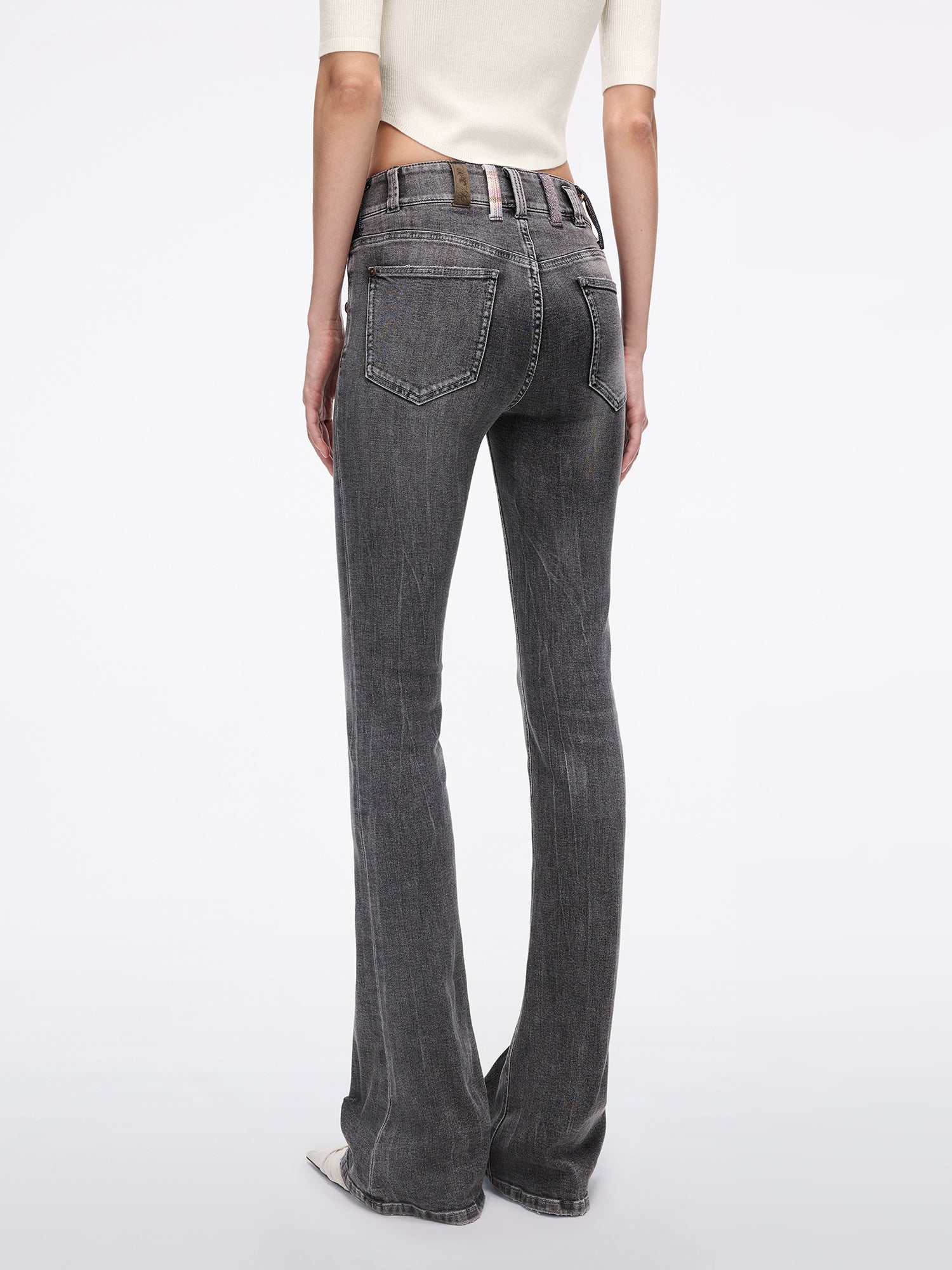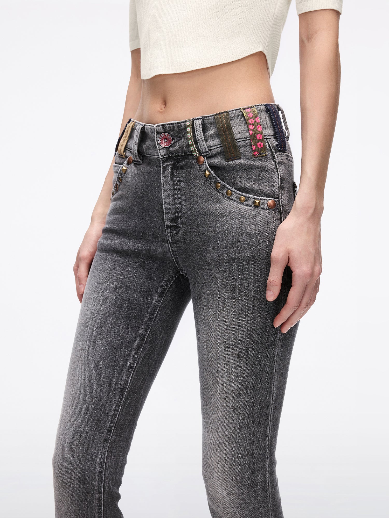 Crafted from premium denim, this fabric is soft against the skin and comfortable to wear. The rugged texture features prominent slubs, and the multiple washing and processing techniques give each piece a unique visual appeal. The pockets are adorned with decorative studs in various shapes, while the multi-belt loop design adds an interesting detail. The slightly flared pant legs create a slimming effect, and the trendy distressed detailing enhances the vintage aesthetic.
